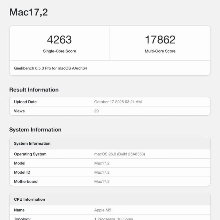 M5 در آزمون تکهستهای گیکبنچ ۶٫۵ به امتیاز ۴۲۶۳ و در بخش چندهستهای به امتیاز ۱۷۸۶۲ دست پیدا کرد؛ امتیاز M5 در بخش چندهستهای به امتیاز تراشهی M1 Ultra نزدیک شده است و تنها حدود هزار امتیاز با M3 Max اختلاف دارد.